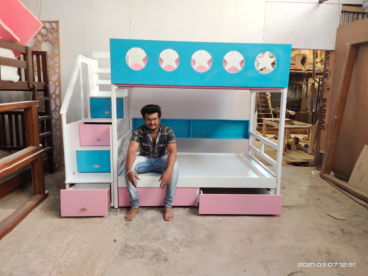 Kids Wooden House Bunk Bed ;- * A Kids Wooden House Bunk Bed is a specially designed bunk bed made from durable wood, shaped like a small house or cottage. It features two levels (upper and lower beds) and often includes playful architectural details like windows, a roof-style frame, and stair access. This bed is not only a place to sleep but also a fun, imaginative space for children to play, read, and relax. ✨ Key Features :- 1. House-Shaped Design :- 1. The bed frame is designed to look like a miniature house, complete with a roof outline, open windows, and decorative elements. 2. This creative structure makes the bed feel like a little home, sparking imagination and role-playing activities. 3. Some versions even allow for hanging curtains or lights to create a cozy atmosphere. 2. Durable Wooden Construction:- 1. Made from high-quality, solid wood such as pinewood and plywood. 2. Strong and stable structure ensures safety and long-term durability. 3. Finished with non-toxic, child-safe paint or varnish, available in natural wood tones or fun pastel colors. 3. Bunk Bed Configuration Includes two sleeping areas: * Lower bunk: Close to the ground, perfect for younger children or toddlers. * Upper bunk: Accessible via stairs, suitable for older kids. Maximizes floor space, making it ideal for shared rooms or small bedrooms. 4. Beautiful Window Cut-Outs:- 1. Stylish window designs are built into the side panels and house frame. 2. Allow natural light to pass through and give a charming, open look. 3. Encourage children to play, peek out, and engage with their space creatively. 5. Storage at the Bottom:- 1. The bed includes built-in drawers and compartments under the lower bunk. 2. Great for organizing toys, clothes, books, or blankets. 3. Helps keep the room tidy and clutter-free, teaching kids organization habits. 6. Easily Climbable Steps:- 1. Instead of a traditional ladder, the bed includes a staircase with wide steps. 2. Safer and easier for kids to climb — especially for younger children. 3. Steps are often designed with handrails and side panels for extra support. 7. Storage in Steps :- 1. Every step of the staircase can double as a pull-out drawers. 2. Ideal for storing small items like socks, toys, or school supplies. 3. A clever use of space that adds functionality without taking up extra room. 🎯 Benefits for Kids and Parents ✔️ For Kids: * Encourages creative play and independent sleep routines. * The 'house' structure creates a feeling of safety and comfort. * Fun and interactive design promotes imaginative thinking. ✔️ For Parents: * Saves space by combining sleeping, storage, and play areas in one unit. * Helps in organizing the room and reducing clutter. * Adds a decorative, stylish touch to the child’s bedroom. 📐 Customization Options :- 1. Can be painted in various colors (Any colour shades.) 2. Available in different sizes (Any sizes customised.) 3. Optional add-ons: curtains, fairy lights, mattress bundles, or extra guardrails. 📞 Book Your order Today! 📧 Email: s.l.woodworksnow@gmail.com ☎ Enquiry;- 6362119197 ( WhatsApp/ Call) 📍Address:- S.L. WOOD WORKS Near Bharath Petrol Bunk off Set Govt High School Vishwa Priya Layout, Begur Rd, vishwapriya layout, Begur, Bengaluru, Karnataka 560068.