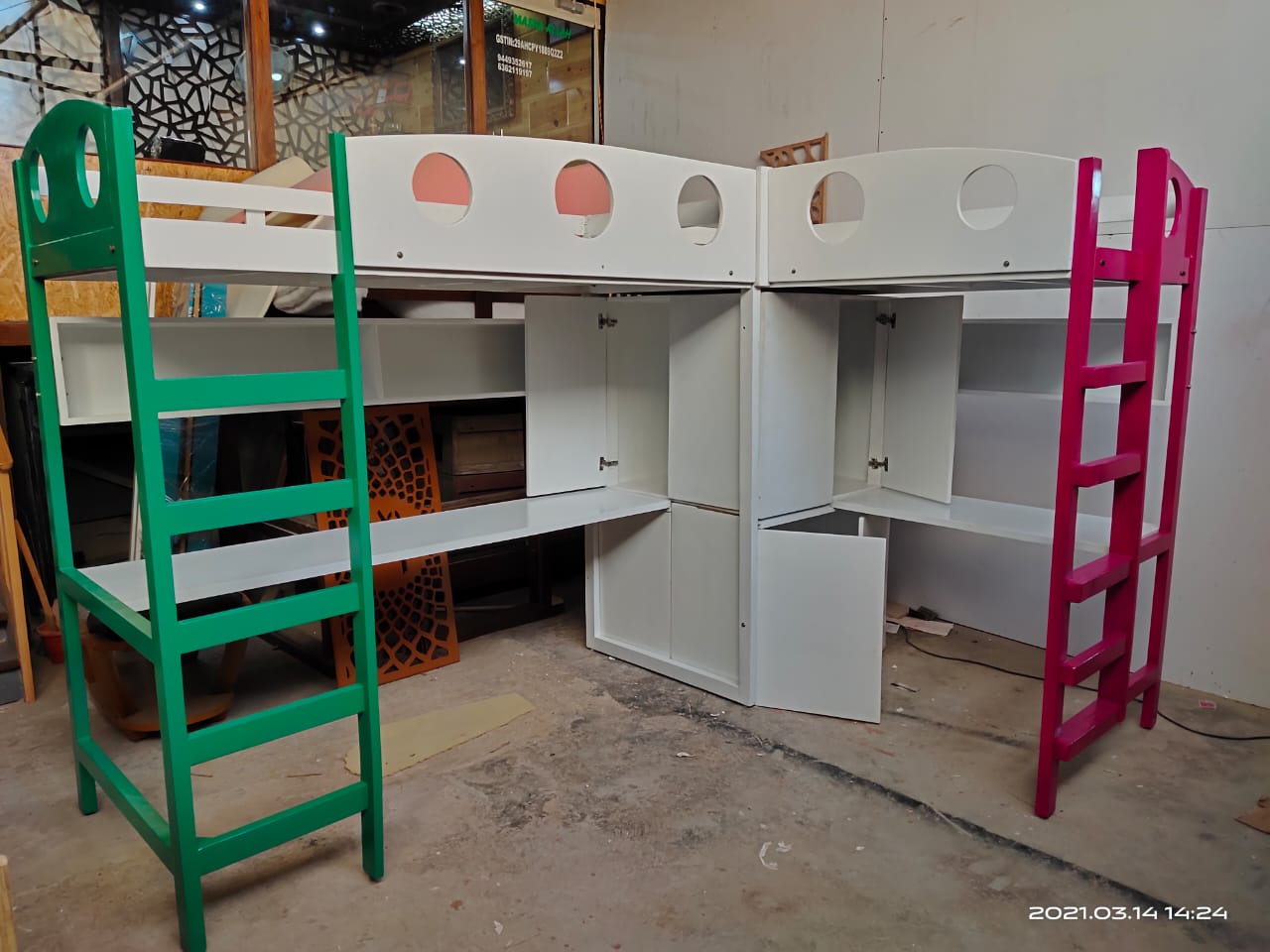 BUNK BED( Study table ) 10Years of Warranty !Durability !Strength !Quality- Life time No Breakage, No shrinkage, No Insect attack Product Specification: Bunker Bed With Good Furnishing and finishing Deco-paint finish 100% Wooden Model Number: bunkerbed-sl-05260000 Place order- Recognize catalogue Designs--Give a Call and Place your Order Storage: with Storage Material : Ply Wood Platforms and 100% Pine Wood Delivery Charges: Free! Free! Free! for Bangalore zone customers Mattress: No mattress Size-L type Bunk Bed- Platform Size-2.5'x6'(Size can be customized) color-Any color Warranty-10 Years of Warranty if any Problem in the product will solve it within 48hours, But no return or change of order once the order has been placed