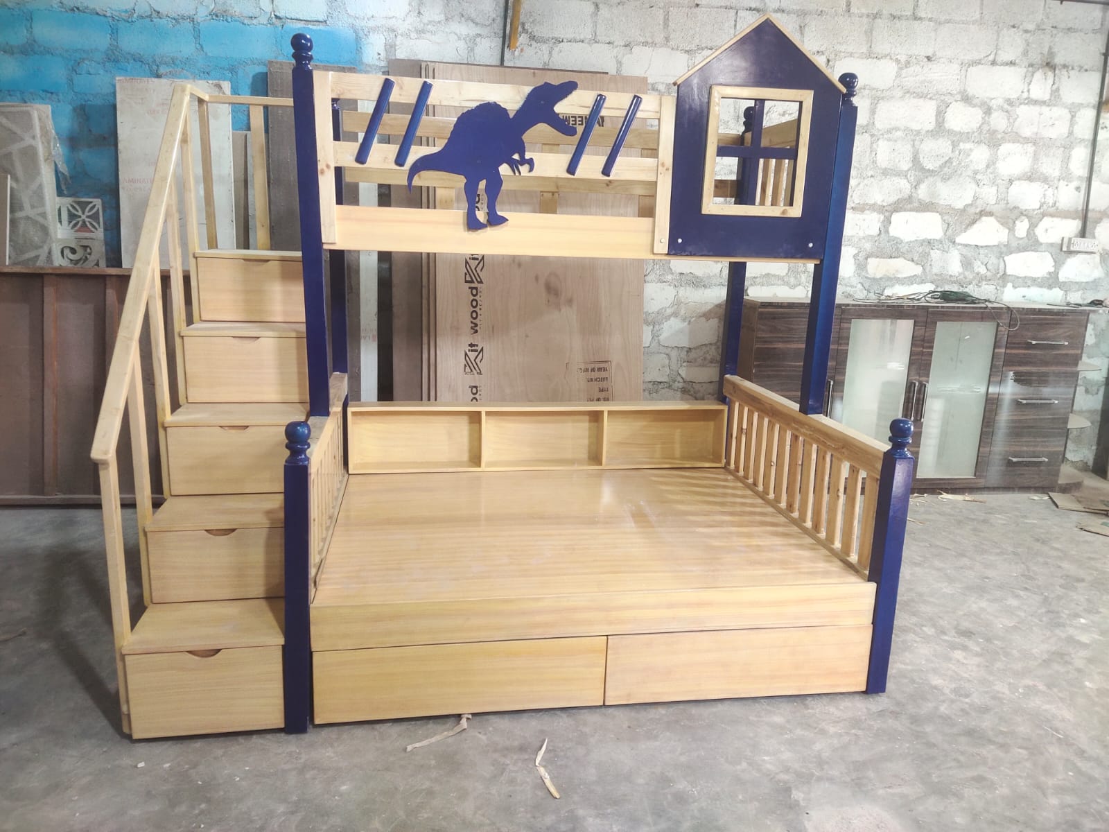 Wooden Hut Bunk Bed with Steps, Storage & Blue-White Paint Finish:- Bring imagination to life with this delightful hut-style wooden bunk bed, designed to look like a cozy little house while offering comfort, safety, and smart storage. * Design Overview: Hut-Inspired Structure:-This bunk bed resembles a charming little wooden cabin, complete with a roof-shaped top frame, window cutouts, and panel-style siding—perfect for sparking creative play and cozy sleepovers. * Wooden Material :- This bunk bed is crafted from high-quality solid wood, known for its strength, durability, and timeless appeal. The material is carefully selected to ensure long-lasting use and a natural, warm aesthetic that complements any interior style. * Pine Wood: Lightweight yet sturdy, pine offers a beautiful grain and smooth finish. It’s an excellent choice for kids' furniture due to its affordability and durability. * Plywood: This bunk bed is constructed using high-grade plywood, a versatile and reliable material known for its strength, stability, and smooth finish. Plywood is an excellent choice for furniture that combines durability with a modern, clean look * Beautiful Paint Finish: Painted in a soft, elegant white base with accents of sky blue, the bed feels bright, cheerful, and calming. The frame and main structure are finished in a smooth, clean white Window trims, railings, and step edges are highlighted in sky blue, adding playful contrast. * Safe Steps with Storage: Instead of a ladder, the bed features a sturdy staircase on the side, making it safer and easier to climb—especially for little ones. Each step doubles as a pull-out storage drawer, perfect for clothes, books, or toys. A built-in handrail ensures extra safety while going up and down. * Built-In Storage Spaces: Underbed drawers for added storage. Optional shelves along the sides of the hut for display or bedtime essentials. * Charming Window Cut-Outs: The upper bunk features decorative window-shaped cutouts that look like real cottage windows—great for peek-a-boo games or letting in natural light.