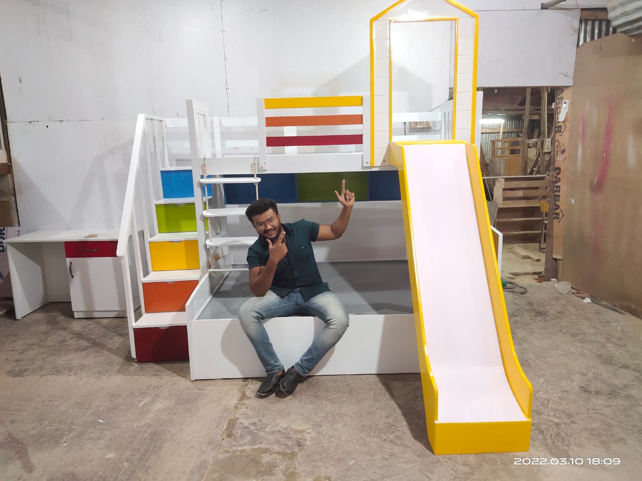" Please enquire for pricing, because custom bunk beds will be having different price list as per requirement " Hut Model Bunk bed 10Years of Warranty !Durability !Strength !Quality- Life time No Breakage, No shrinkage, No Insect attack Product Specification: Bunker Bed With Good Furnishing and finishing Deco-paint finish 100% Wooden Place order- Recognize catalogue Designs--Give a Call and Place your Order Storage: hydraulic With storage and steps storage Material : Ply Wood Platforms and 100% Pine Wood Delivery : complete bangalore zone free Mattress: No mattress Size- bottom platform 4'widthx6'length and upper platform size- 3'x6' ( can be customized as per your requirement) color-Any color Warranty-10 Years of Warranty if any Problem in the product will solve it within 48hours, But no return or change of order once the order has been placed Pricing might differ as per section based, please make a enquiry post for costing Kids Bunk Bed-2/2.5 section Heavier- 3/4 sections