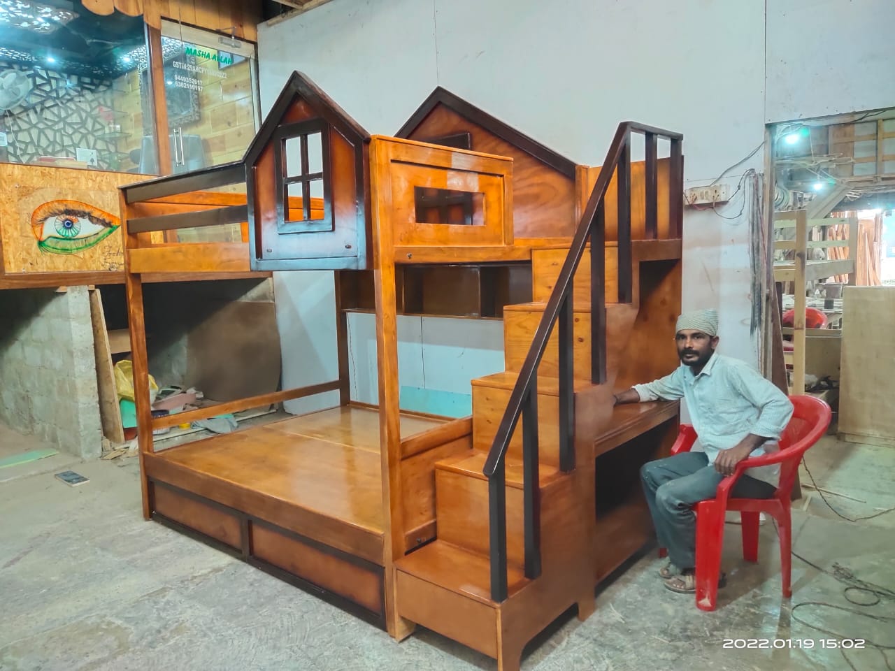 Kids Wooden House Bunk Bed ;- * A Kids Wooden House Bunk Bed is a specially designed bunk bed made from durable wood, shaped like a small house or cottage. It features two levels (upper and lower beds) and often includes playful architectural details like windows, a roof-style frame, and stair access. This bed is not only a place to sleep but also a fun, imaginative space for children to play, read, and relax. ✨ Key Features :- 1. House-Shaped Design :- 1. The bed frame is designed to look like a miniature house, complete with a roof outline, open windows, and decorative elements. 2. This creative structure makes the bed feel like a little home, sparking imagination and role-playing activities. 3. Some versions even allow for hanging curtains or lights to create a cozy atmosphere. 2. Durable Wooden Construction:- 1. Made from high-quality, solid wood such as pinewood and plywood. 2. Strong and stable structure ensures safety and long-term durability. 3. Finished with non-toxic, child-safe paint or varnish, available in natural wood tones or fun pastel colors. 3. Bunk Bed Configuration Includes two sleeping areas: * Lower bunk: Close to the ground, perfect for younger children or toddlers. * Upper bunk: Accessible via stairs, suitable for older kids. Maximizes floor space, making it ideal for shared rooms or small bedrooms. 4. Beautiful Window Cut-Outs:- 1. Stylish window designs are built into the side panels and house frame. 2. Allow natural light to pass through and give a charming, open look. 3. Encourage children to play, peek out, and engage with their space creatively. 5. Storage at the Bottom:- 1. The bed includes built-in drawers and compartments under the lower bunk. 2. Great for organizing toys, clothes, books, or blankets. 3. Helps keep the room tidy and clutter-free, teaching kids organization habits. 6. Easily Climbable Steps:- 1. Instead of a traditional ladder, the bed includes a staircase with wide steps. 2. Safer and easier for kids to climb — especially for younger children. 3. Steps are often designed with handrails and side panels for extra support. 7. Storage in Steps :- 1. Every step of the staircase can double as a pull-out drawers. 2. Ideal for storing small items like socks, toys, or school supplies. 3. A clever use of space that adds functionality without taking up extra room. 🎯 Benefits for Kids and Parents ✔️ For Kids: * Encourages creative play and independent sleep routines. * The 'house' structure creates a feeling of safety and comfort. * Fun and interactive design promotes imaginative thinking. ✔️ For Parents: * Saves space by combining sleeping, storage, and play areas in one unit. * Helps in organizing the room and reducing clutter. * Adds a decorative, stylish touch to the child’s bedroom. 📐 Customization Options :- 1. Can be painted in various colors (Any colour shades.) 2. Available in different sizes (Any sizes customised.) 3. Optional add-ons: curtains, fairy lights, mattress bundles, or extra guardrails. 📞 Book Your order Today! 📧 Email: s.l.woodworksnow@gmail.com ☎ Enquiry;- 6362119197 ( WhatsApp/ Call) 📍Address:- S.L. WOOD WORKS Near Bharath Petrol Bunk off Set Govt High School Vishwa Priya Layout, Begur Rd, vishwapriya layout, Begur, Bengaluru, Karnataka 560068.