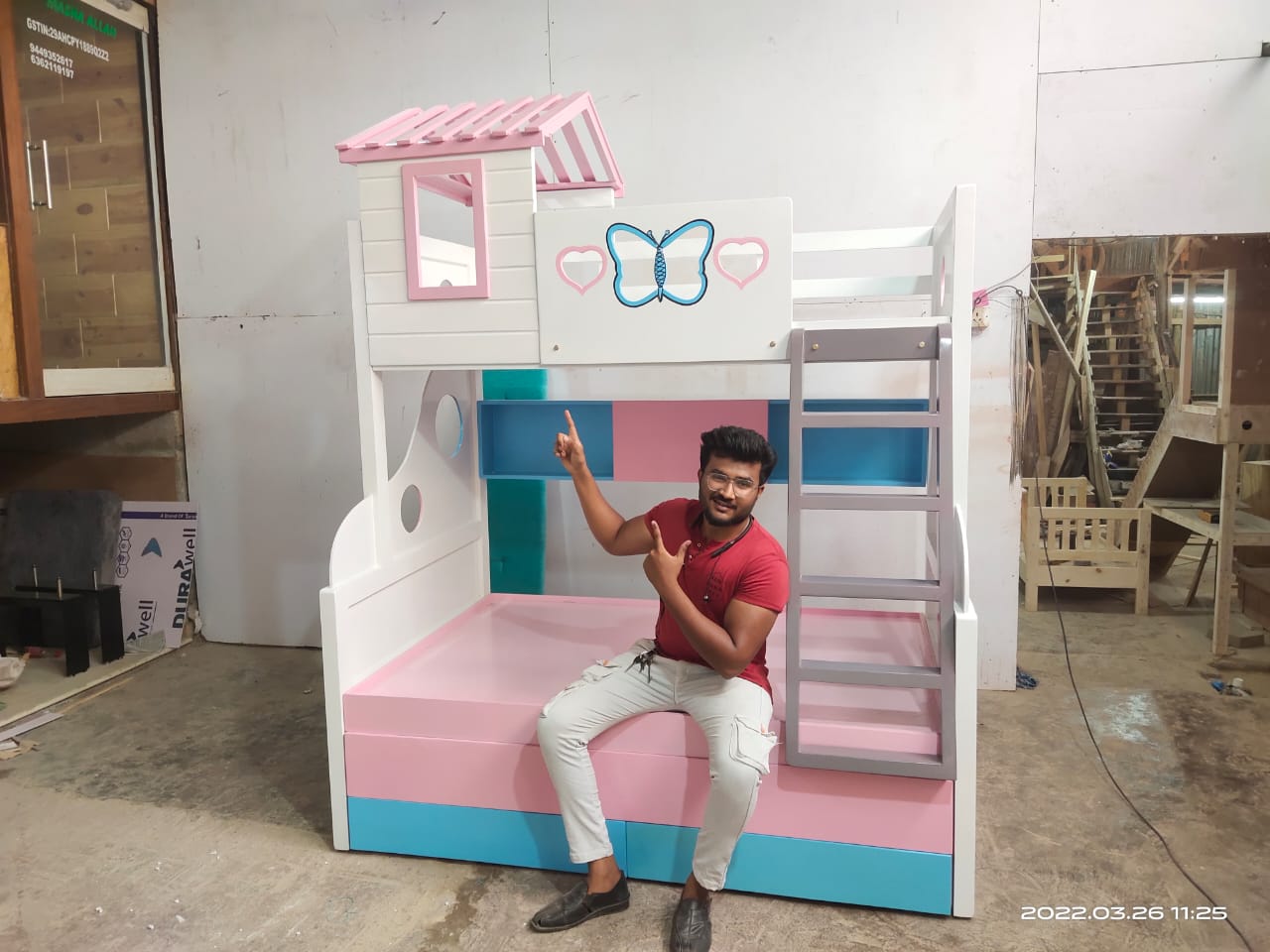 Kids Wooden House Bunk Bed ;- * A Kids Wooden House Bunk Bed is a specially designed bunk bed made from durable wood, shaped like a small house or cottage. It features two levels (upper and lower beds) and often includes playful architectural details like windows, a roof-style frame, and stair access. This bed is not only a place to sleep but also a fun, imaginative space for children to play, read, and relax. ✨ Key Features :- 1. House-Shaped Design :- 1. The bed frame is designed to look like a miniature house, complete with a roof outline, open windows, and decorative elements. 2. This creative structure makes the bed feel like a little home, sparking imagination and role-playing activities. 3. Some versions even allow for hanging curtains or lights to create a cozy atmosphere. 2. Durable Wooden Construction:- 1. Made from high-quality, solid wood such as pinewood and plywood. 2. Strong and stable structure ensures safety and long-term durability. 3. Finished with non-toxic, child-safe paint or varnish, available in natural wood tones or fun pastel colors. 3. Bunk Bed Configuration Includes two sleeping areas: * Lower bunk: Close to the ground, perfect for younger children or toddlers. * Upper bunk: Accessible via stairs, suitable for older kids. Maximizes floor space, making it ideal for shared rooms or small bedrooms. 4. Beautiful Window Cut-Outs:- 1. Stylish window designs are built into the side panels and house frame. 2. Allow natural light to pass through and give a charming, open look. 3. Encourage children to play, peek out, and engage with their space creatively. 5. Storage at the Bottom:- 1. The bed includes built-in drawers and compartments under the lower bunk. 2. Great for organizing toys, clothes, books, or blankets. 3. Helps keep the room tidy and clutter-free, teaching kids organization habits. 6. Easily Climbable Steps:- 1. Instead of a traditional ladder, the bed includes a staircase with wide steps. 2. Safer and easier for kids to climb — especially for younger children. 3. Steps are often designed with handrails and side panels for extra support. 7. Storage in Steps :- 1. Every step of the staircase can double as a pull-out drawers. 2. Ideal for storing small items like socks, toys, or school supplies. 3. A clever use of space that adds functionality without taking up extra room. 🎯 Benefits for Kids and Parents ✔️ For Kids: * Encourages creative play and independent sleep routines. * The 'house' structure creates a feeling of safety and comfort. * Fun and interactive design promotes imaginative thinking. ✔️ For Parents: * Saves space by combining sleeping, storage, and play areas in one unit. * Helps in organizing the room and reducing clutter. * Adds a decorative, stylish touch to the child’s bedroom. 📐 Customization Options :- 1. Can be painted in various colors (Any colour shades.) 2. Available in different sizes (Any sizes customised.) 3. Optional add-ons: curtains, fairy lights, mattress bundles, or extra guardrails. 📞 Book Your order Today! 📧 Email: s.l.woodworksnow@gmail.com ☎ Enquiry;- 6362119197 ( WhatsApp/ Call) 📍Address:- S.L. WOOD WORKS Near Bharath Petrol Bunk off Set Govt High School Vishwa Priya Layout, Begur Rd, vishwapriya layout, Begur, Bengaluru, Karnataka 560068.