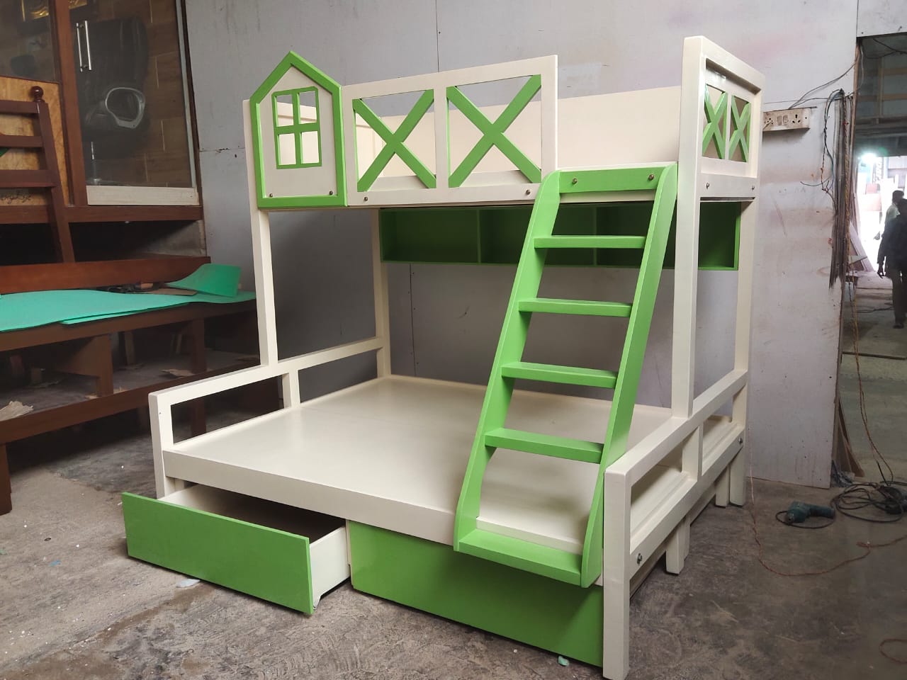 Kids Wooden House Bunk Bed ;- * A Kids Wooden House Bunk Bed is a specially designed bunk bed made from durable wood, shaped like a small house or cottage. It features two levels (upper and lower beds) and often includes playful architectural details like windows, a roof-style frame, and stair access. This bed is not only a place to sleep but also a fun, imaginative space for children to play, read, and relax. ✨ Key Features :- 1. House-Shaped Design :- 1. The bed frame is designed to look like a miniature house, complete with a roof outline, open windows, and decorative elements. 2. This creative structure makes the bed feel like a little home, sparking imagination and role-playing activities. 3. Some versions even allow for hanging curtains or lights to create a cozy atmosphere. 2. Durable Wooden Construction:- 1. Made from high-quality, solid wood such as pinewood and plywood. 2. Strong and stable structure ensures safety and long-term durability. 3. Finished with non-toxic, child-safe paint or varnish, available in natural wood tones or fun pastel colors. 3. Bunk Bed Configuration Includes two sleeping areas: * Lower bunk: Close to the ground, perfect for younger children or toddlers. * Upper bunk: Accessible via stairs, suitable for older kids. Maximizes floor space, making it ideal for shared rooms or small bedrooms. 4. Beautiful Window Cut-Outs:- 1. Stylish window designs are built into the side panels and house frame. 2. Allow natural light to pass through and give a charming, open look. 3. Encourage children to play, peek out, and engage with their space creatively. 5. Storage at the Bottom:- 1. The bed includes built-in drawers and compartments under the lower bunk. 2. Great for organizing toys, clothes, books, or blankets. 3. Helps keep the room tidy and clutter-free, teaching kids organization habits. 6. Easily Climbable Steps:- 1. Instead of a traditional ladder, the bed includes a staircase with wide steps. 2. Safer and easier for kids to climb — especially for younger children. 3. Steps are often designed with handrails and side panels for extra support. 7. Storage in Steps :- 1. Every step of the staircase can double as a pull-out drawers. 2. Ideal for storing small items like socks, toys, or school supplies. 3. A clever use of space that adds functionality without taking up extra room. 🎯 Benefits for Kids and Parents ✔️ For Kids: * Encourages creative play and independent sleep routines. * The 'house' structure creates a feeling of safety and comfort. * Fun and interactive design promotes imaginative thinking. ✔️ For Parents: * Saves space by combining sleeping, storage, and play areas in one unit. * Helps in organizing the room and reducing clutter. * Adds a decorative, stylish touch to the child’s bedroom. 📐 Customization Options :- 1. Can be painted in various colors (Any colour shades.) 2. Available in different sizes (Any sizes customised.) 3. Optional add-ons: curtains, fairy lights, mattress bundles, or extra guardrails. 📞 Book Your order Today! 📧 Email: s.l.woodworksnow@gmail.com ☎ Enquiry;- 6362119197 ( WhatsApp/ Call) 📍Address:- S.L. WOOD WORKS Near Bharath Petrol Bunk off Set Govt High School Vishwa Priya Layout, Begur Rd, vishwapriya layout, Begur, Bengaluru, Karnataka 560068.