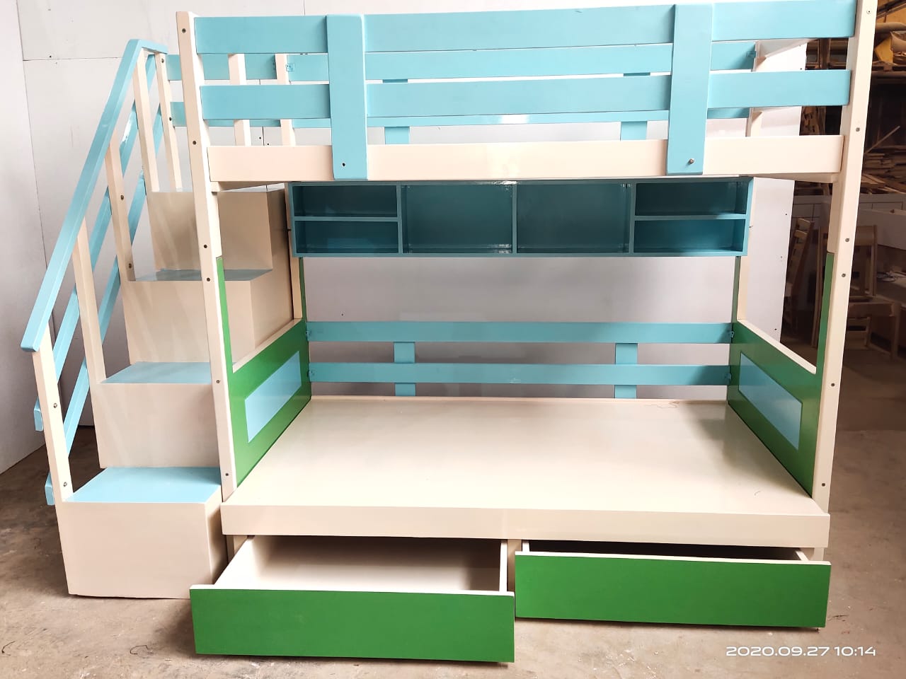 Wooden Hut Bunk Bed with Steps, Storage & Blue-White Paint Finish:- Bring imagination to life with this delightful hut-style wooden bunk bed, designed to look like a cozy little house while offering comfort, safety, and smart storage. * Design Overview: Hut-Inspired Structure:-This bunk bed resembles a charming little wooden cabin, complete with a roof-shaped top frame, window cutouts, and panel-style siding—perfect for sparking creative play and cozy sleepovers. * Wooden Material :- This bunk bed is crafted from high-quality solid wood, known for its strength, durability, and timeless appeal. The material is carefully selected to ensure long-lasting use and a natural, warm aesthetic that complements any interior style. * Pine Wood: Lightweight yet sturdy, pine offers a beautiful grain and smooth finish. It’s an excellent choice for kids' furniture due to its affordability and durability. * Plywood: This bunk bed is constructed using high-grade plywood, a versatile and reliable material known for its strength, stability, and smooth finish. Plywood is an excellent choice for furniture that combines durability with a modern, clean look * Beautiful Paint Finish: Painted in a soft, elegant white base with accents of sky blue, the bed feels bright, cheerful, and calming. The frame and main structure are finished in a smooth, clean white Window trims, railings, and step edges are highlighted in sky blue, adding playful contrast. * Safe Steps with Storage: Instead of a ladder, the bed features a sturdy staircase on the side, making it safer and easier to climb—especially for little ones. Each step doubles as a pull-out storage drawer, perfect for clothes, books, or toys. A built-in handrail ensures extra safety while going up and down. * Built-In Storage Spaces: Underbed drawers for added storage. Optional shelves along the sides of the hut for display or bedtime essentials. * Charming Window Cut-Outs: The upper bunk features decorative window-shaped cutouts that look like real cottage windows—great for peek-a-boo games or letting in natural light.