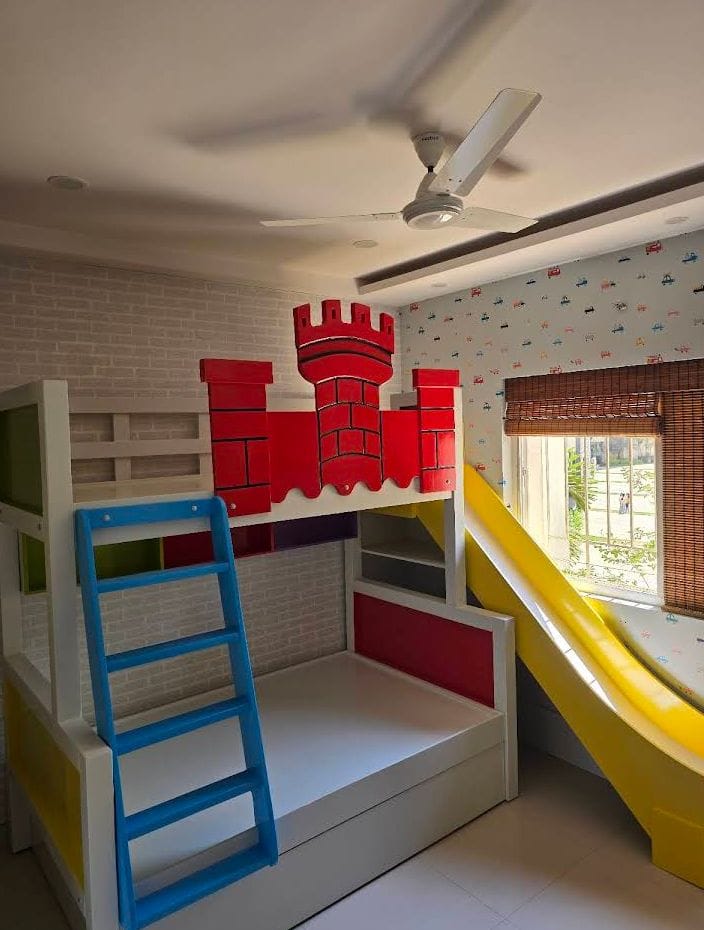 Wooden Hut Bunk Bed with Steps, Storage & Blue-White Paint Finish:- Bring imagination to life with this delightful hut-style wooden bunk bed, designed to look like a cozy little house while offering comfort, safety, and smart storage. * Design Overview: Hut-Inspired Structure:-This bunk bed resembles a charming little wooden cabin, complete with a roof-shaped top frame, window cutouts, and panel-style siding—perfect for sparking creative play and cozy sleepovers. * Wooden Material :- This bunk bed is crafted from high-quality solid wood, known for its strength, durability, and timeless appeal. The material is carefully selected to ensure long-lasting use and a natural, warm aesthetic that complements any interior style. * Pine Wood: Lightweight yet sturdy, pine offers a beautiful grain and smooth finish. It’s an excellent choice for kids' furniture due to its affordability and durability. * Plywood: This bunk bed is constructed using high-grade plywood, a versatile and reliable material known for its strength, stability, and smooth finish. Plywood is an excellent choice for furniture that combines durability with a modern, clean look * Beautiful Paint Finish: Painted in a soft, elegant white base with accents of sky blue, the bed feels bright, cheerful, and calming. The frame and main structure are finished in a smooth, clean white Window trims, railings, and step edges are highlighted in sky blue, adding playful contrast. * Safe Steps with Storage: Instead of a ladder, the bed features a sturdy staircase on the side, making it safer and easier to climb—especially for little ones. Each step doubles as a pull-out storage drawer, perfect for clothes, books, or toys. A built-in handrail ensures extra safety while going up and down. * Built-In Storage Spaces: Underbed drawers for added storage. Optional shelves along the sides of the hut for display or bedtime essentials. * Charming Window Cut-Outs: The upper bunk features decorative window-shaped cutouts that look like real cottage windows—great for peek-a-boo games or letting in natural light.