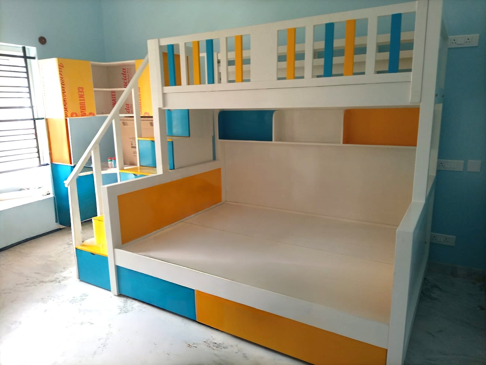 Wooden Hut Bunk Bed with Steps, Storage & Blue-White Paint Finish:- Bring imagination to life with this delightful hut-style wooden bunk bed, designed to look like a cozy little house while offering comfort, safety, and smart storage. * Design Overview: Hut-Inspired Structure:-This bunk bed resembles a charming little wooden cabin, complete with a roof-shaped top frame, window cutouts, and panel-style siding—perfect for sparking creative play and cozy sleepovers. * Wooden Material :- This bunk bed is crafted from high-quality solid wood, known for its strength, durability, and timeless appeal. The material is carefully selected to ensure long-lasting use and a natural, warm aesthetic that complements any interior style. * Pine Wood: Lightweight yet sturdy, pine offers a beautiful grain and smooth finish. It’s an excellent choice for kids' furniture due to its affordability and durability. * Plywood: This bunk bed is constructed using high-grade plywood, a versatile and reliable material known for its strength, stability, and smooth finish. Plywood is an excellent choice for furniture that combines durability with a modern, clean look * Beautiful Paint Finish: Painted in a soft, elegant white base with accents of sky blue, the bed feels bright, cheerful, and calming. The frame and main structure are finished in a smooth, clean white Window trims, railings, and step edges are highlighted in sky blue, adding playful contrast. * Safe Steps with Storage: Instead of a ladder, the bed features a sturdy staircase on the side, making it safer and easier to climb—especially for little ones. Each step doubles as a pull-out storage drawer, perfect for clothes, books, or toys. A built-in handrail ensures extra safety while going up and down. * Built-In Storage Spaces: Underbed drawers for added storage. Optional shelves along the sides of the hut for display or bedtime essentials. * Charming Window Cut-Outs: The upper bunk features decorative window-shaped cutouts that look like real cottage windows—great for peek-a-boo games or letting in natural light.