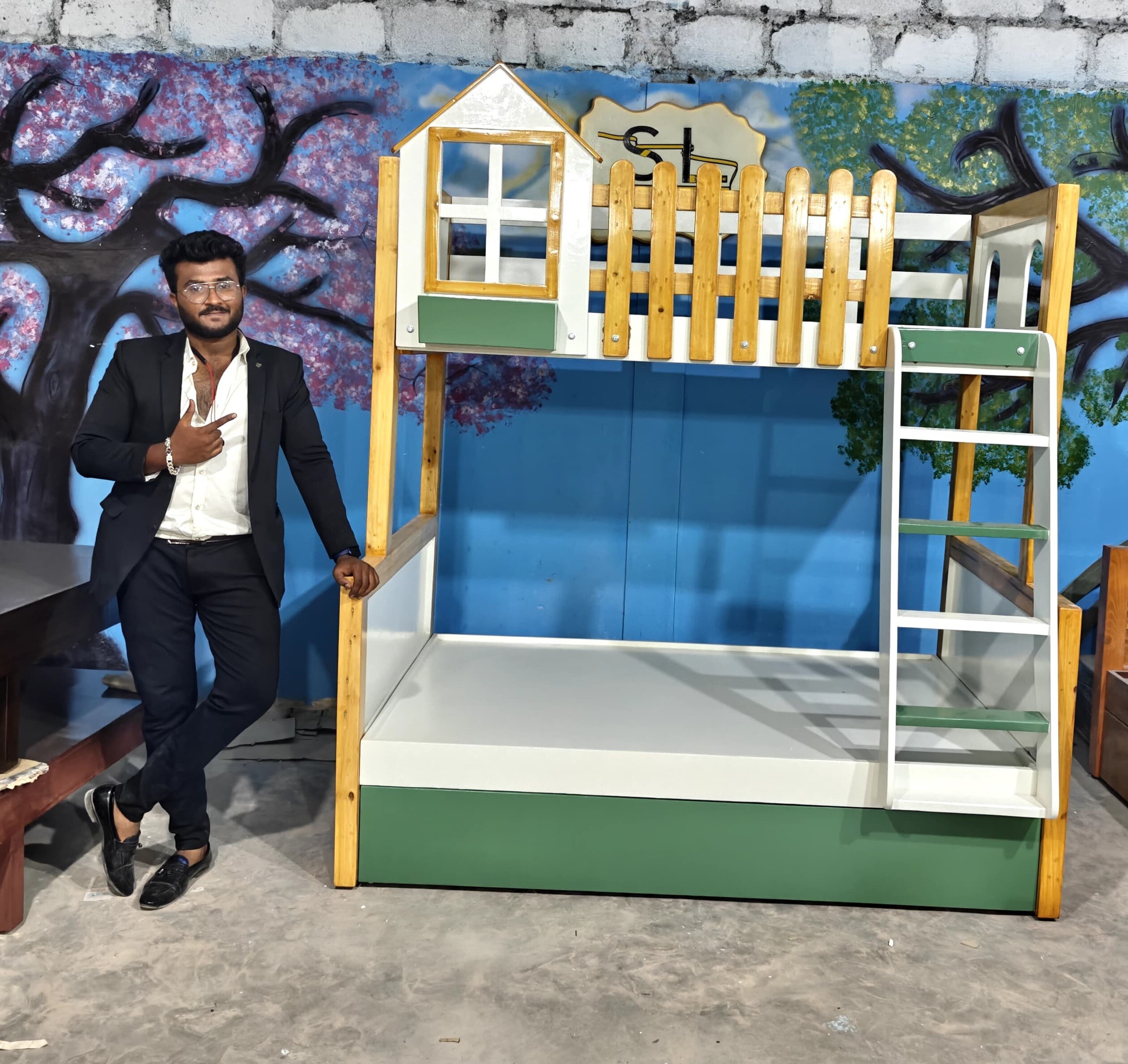 Kids Wooden House Bunk Bed ;- * A Kids Wooden House Bunk Bed is a specially designed bunk bed made from durable wood, shaped like a small house or cottage. It features two levels (upper and lower beds) and often includes playful architectural details like windows, a roof-style frame, and stair access. This bed is not only a place to sleep but also a fun, imaginative space for children to play, read, and relax. ✨ Key Features :- 1. House-Shaped Design :- 1. The bed frame is designed to look like a miniature house, complete with a roof outline, open windows, and decorative elements. 2. This creative structure makes the bed feel like a little home, sparking imagination and role-playing activities. 3. Some versions even allow for hanging curtains or lights to create a cozy atmosphere. 2. Durable Wooden Construction:- 1. Made from high-quality, solid wood such as pinewood and plywood. 2. Strong and stable structure ensures safety and long-term durability. 3. Finished with non-toxic, child-safe paint or varnish, available in natural wood tones or fun pastel colors. 3. Bunk Bed Configuration Includes two sleeping areas: * Lower bunk: Close to the ground, perfect for younger children or toddlers. * Upper bunk: Accessible via stairs, suitable for older kids. Maximizes floor space, making it ideal for shared rooms or small bedrooms. 4. Beautiful Window Cut-Outs:- 1. Stylish window designs are built into the side panels and house frame. 2. Allow natural light to pass through and give a charming, open look. 3. Encourage children to play, peek out, and engage with their space creatively. 5. Storage at the Bottom:- 1. The bed includes built-in drawers and compartments under the lower bunk. 2. Great for organizing toys, clothes, books, or blankets. 3. Helps keep the room tidy and clutter-free, teaching kids organization habits. 6. Easily Climbable Steps:- 1. Instead of a traditional ladder, the bed includes a staircase with wide steps. 2. Safer and easier for kids to climb — especially for younger children. 3. Steps are often designed with handrails and side panels for extra support. 7. Storage in Steps :- 1. Every step of the staircase can double as a pull-out drawers. 2. Ideal for storing small items like socks, toys, or school supplies. 3. A clever use of space that adds functionality without taking up extra room. 🎯 Benefits for Kids and Parents ✔️ For Kids: * Encourages creative play and independent sleep routines. * The 'house' structure creates a feeling of safety and comfort. * Fun and interactive design promotes imaginative thinking. ✔️ For Parents: * Saves space by combining sleeping, storage, and play areas in one unit. * Helps in organizing the room and reducing clutter. * Adds a decorative, stylish touch to the child’s bedroom. 📐 Customization Options :- 1. Can be painted in various colors (Any colour shades.) 2. Available in different sizes (Any sizes customised.) 3. Optional add-ons: curtains, fairy lights, mattress bundles, or extra guardrails. 📞 Book Your order Today! 📧 Email: s.l.woodworksnow@gmail.com ☎ Enquiry;- 6362119197 ( WhatsApp/ Call) 📍Address:- S.L. WOOD WORKS Near Bharath Petrol Bunk off Set Govt High School Vishwa Priya Layout, Begur Rd, vishwapriya layout, Begur, Bengaluru, Karnataka 560068.