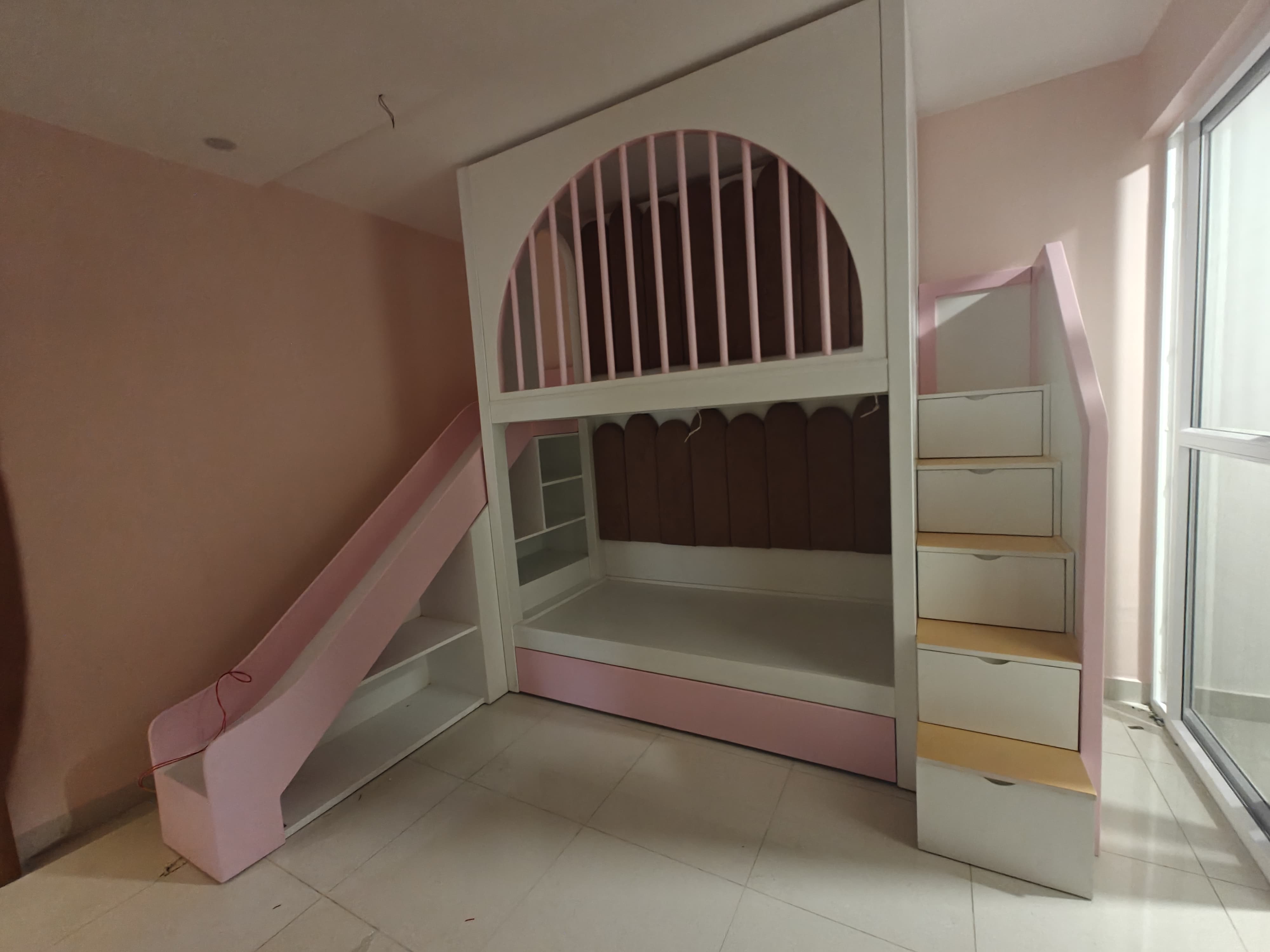 Kids Wooden House Bunk Bed ;- * A Kids Wooden House Bunk Bed is a specially designed bunk bed made from durable wood, shaped like a small house or cottage. It features two levels (upper and lower beds) and often includes playful architectural details like windows, a roof-style frame, and stair access. This bed is not only a place to sleep but also a fun, imaginative space for children to play, read, and relax. ✨ Key Features :- 1. House-Shaped Design :- 1. The bed frame is designed to look like a miniature house, complete with a roof outline, open windows, and decorative elements. 2. This creative structure makes the bed feel like a little home, sparking imagination and role-playing activities. 3. Some versions even allow for hanging curtains or lights to create a cozy atmosphere. 2. Durable Wooden Construction:- 1. Made from high-quality, solid wood such as pinewood and plywood. 2. Strong and stable structure ensures safety and long-term durability. 3. Finished with non-toxic, child-safe paint or varnish, available in natural wood tones or fun pastel colors. 3. Bunk Bed Configuration Includes two sleeping areas: * Lower bunk: Close to the ground, perfect for younger children or toddlers. * Upper bunk: Accessible via stairs, suitable for older kids. Maximizes floor space, making it ideal for shared rooms or small bedrooms. 4. Beautiful Window Cut-Outs:- 1. Stylish window designs are built into the side panels and house frame. 2. Allow natural light to pass through and give a charming, open look. 3. Encourage children to play, peek out, and engage with their space creatively. 5. Storage at the Bottom:- 1. The bed includes built-in drawers and compartments under the lower bunk. 2. Great for organizing toys, clothes, books, or blankets. 3. Helps keep the room tidy and clutter-free, teaching kids organization habits. 6. Easily Climbable Steps:- 1. Instead of a traditional ladder, the bed includes a staircase with wide steps. 2. Safer and easier for kids to climb — especially for younger children. 3. Steps are often designed with handrails and side panels for extra support. 7. Storage in Steps :- 1. Every step of the staircase can double as a pull-out drawers. 2. Ideal for storing small items like socks, toys, or school supplies. 3. A clever use of space that adds functionality without taking up extra room. 🎯 Benefits for Kids and Parents ✔️ For Kids: * Encourages creative play and independent sleep routines. * The 'house' structure creates a feeling of safety and comfort. * Fun and interactive design promotes imaginative thinking. ✔️ For Parents: * Saves space by combining sleeping, storage, and play areas in one unit. * Helps in organizing the room and reducing clutter. * Adds a decorative, stylish touch to the child’s bedroom. 📐 Customization Options :- 1. Can be painted in various colors (Any colour shades.) 2. Available in different sizes (Any sizes customised.) 3. Optional add-ons: curtains, fairy lights, mattress bundles, or extra guardrails. 📞 Book Your order Today! 📧 Email: s.l.woodworksnow@gmail.com ☎ Enquiry;- 6362119197 ( WhatsApp/ Call) 📍Address:- S.L. WOOD WORKS Near Bharath Petrol Bunk off Set Govt High School Vishwa Priya Layout, Begur Rd, vishwapriya layout, Begur, Bengaluru, Karnataka 560068.
